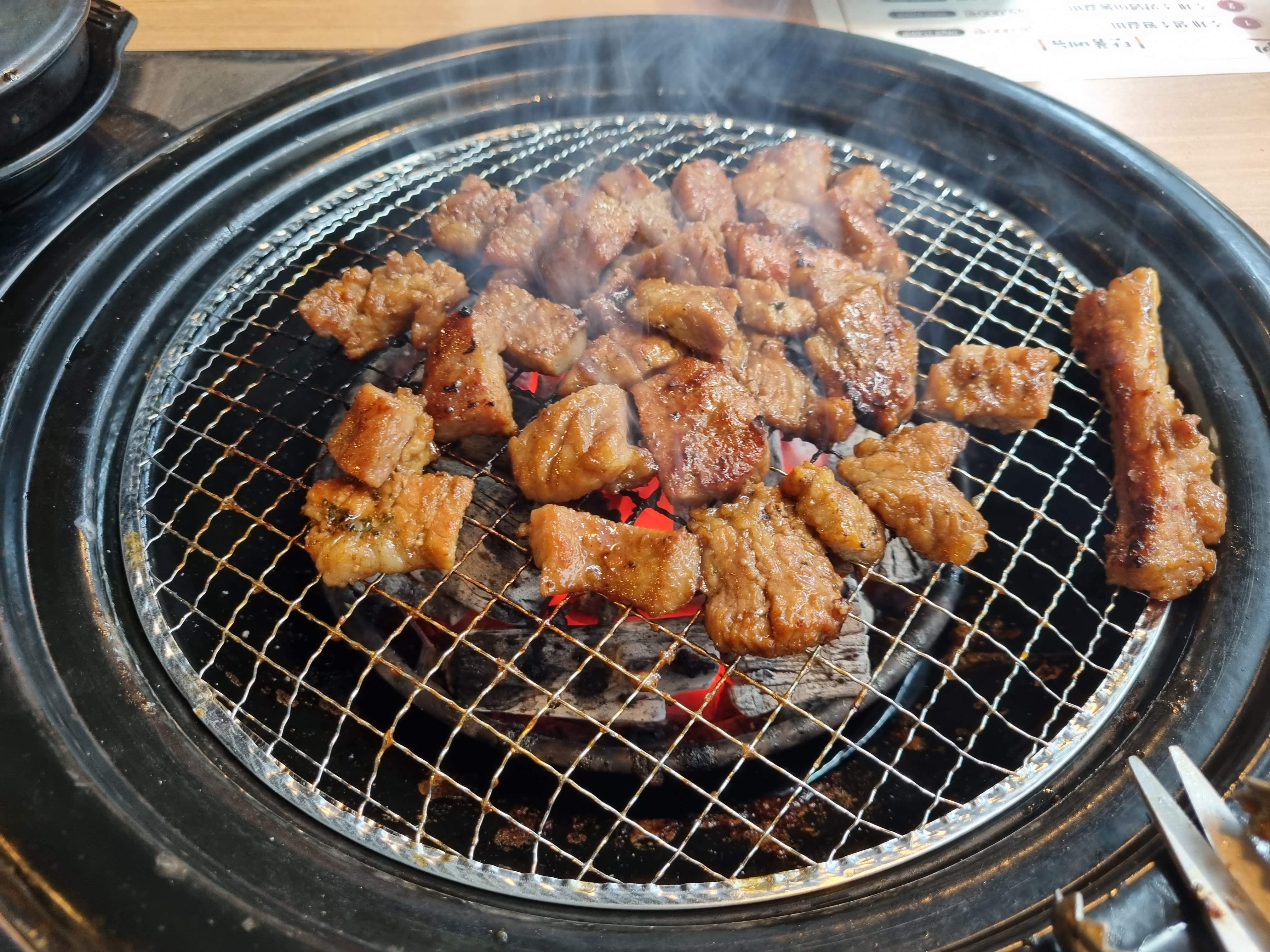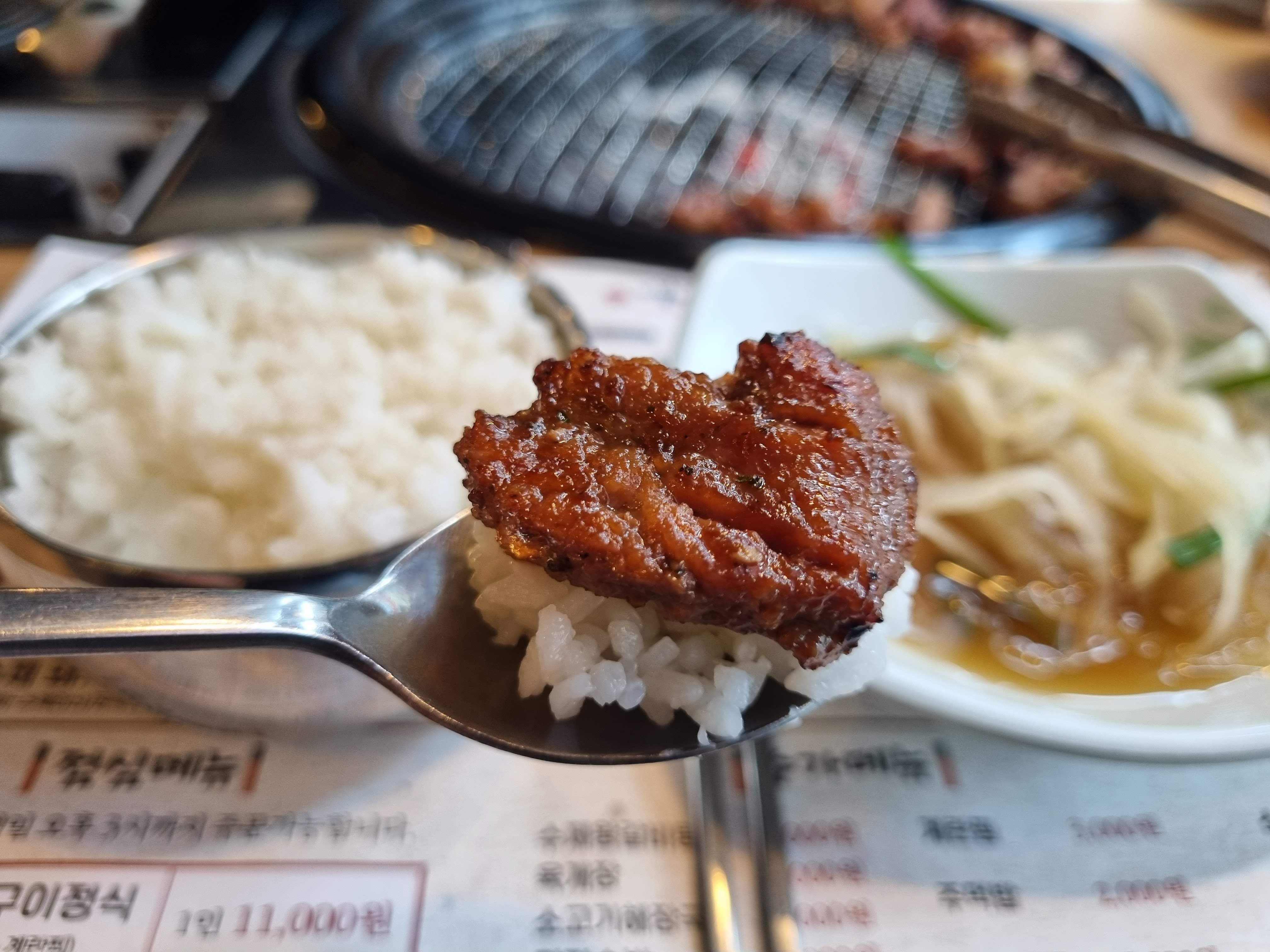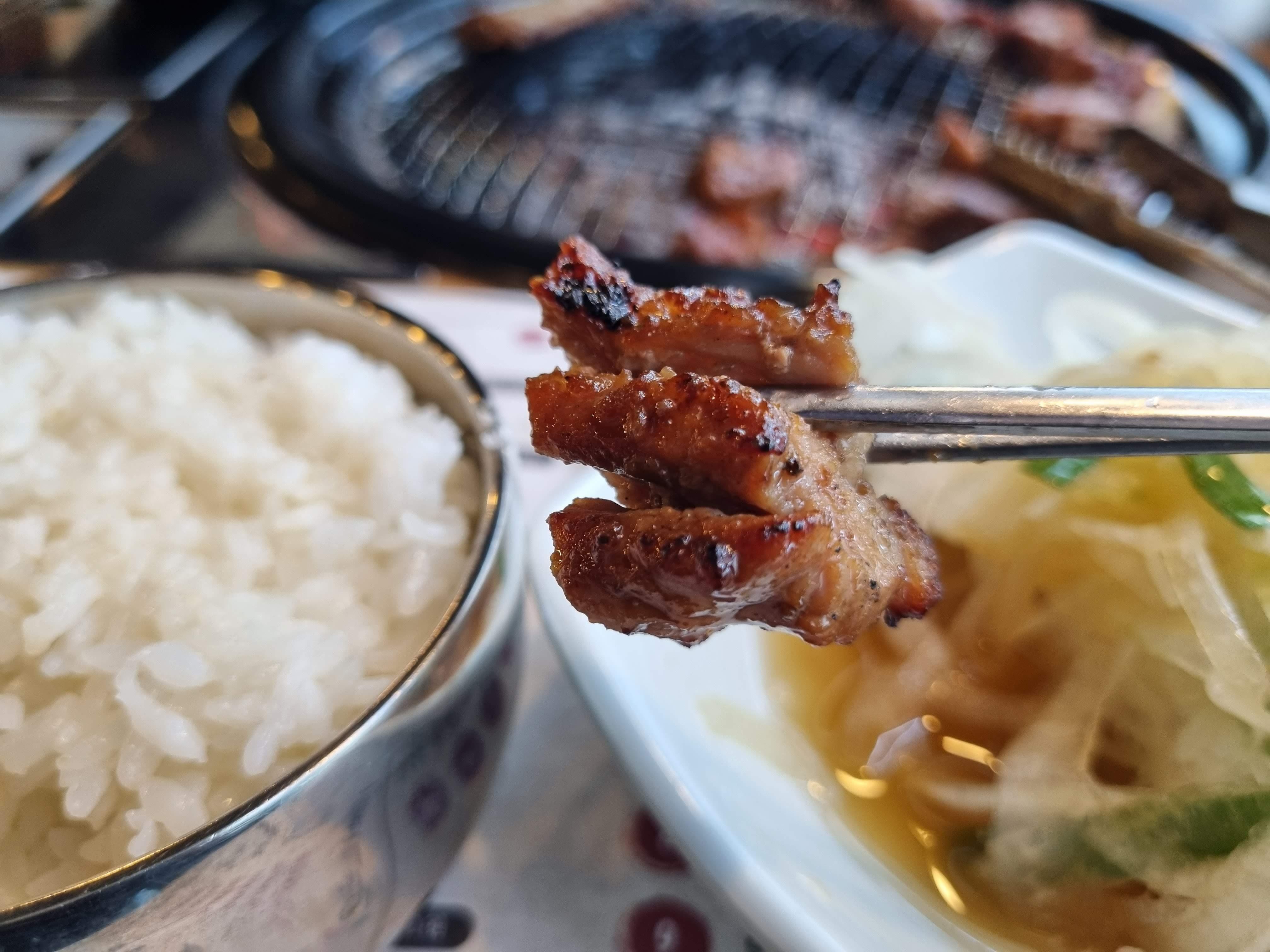 다 익은 돼지갈비 첫 점을 흰쌀밥에 올려먹었다