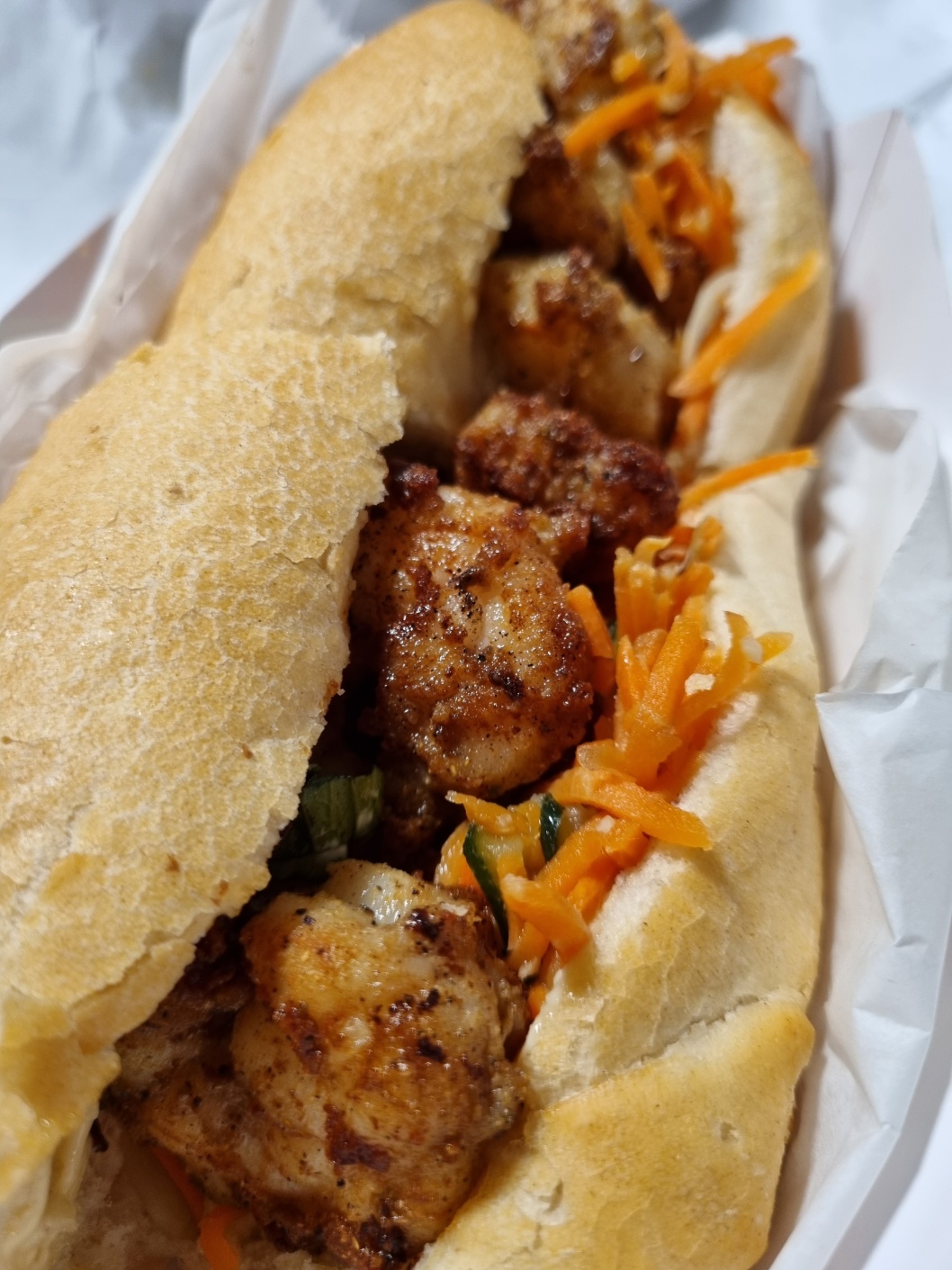 : 부드러운 바게트 + 짭짤한 새우 + 상큼한 야채 + 고소한 마요소스 = 천국