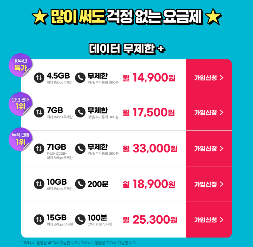홈페이지에 들어가보면 다양한 요금제 옵션들을 확인할 수 있다.