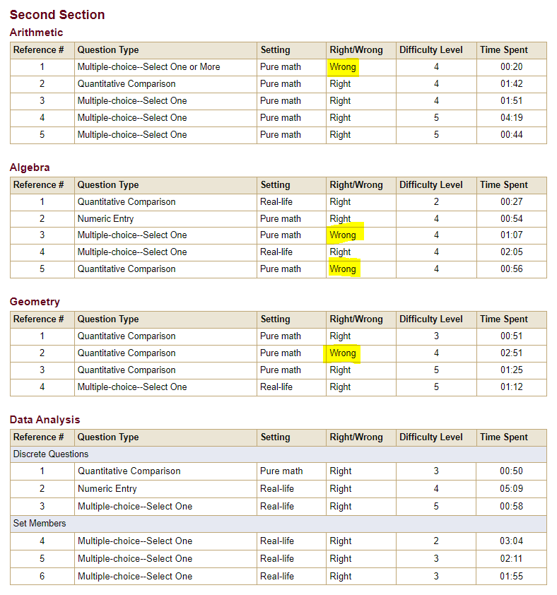 Diagnostic Service(진단표)를 확인해보니 틀린 문제 중 풀이 시간이 길지 않은 문제도 있었던 것으로 보아 실수도 있었던 것 같다. 첫번째 시험을 다 맞아서 두 번째 시험 문제는 대부분 난이도가 높게 책정 되었다.